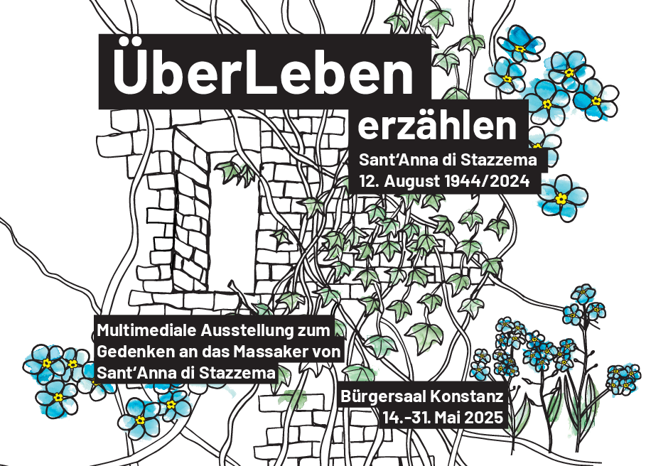 | 14. – 31.05.2025 | Ausstellung „ÜberLeben Erzählen. Sant’Anna di Stazzema, 12. August 1944/2024“ Die Ausstellung widmet sich den Kindern von Sant’Anna di Stazzema, die das SS-Massaker am 12. August 1944 überlebt haben. Sie, ihre Kinder und Enkel erzählen auf sehr unterschiedliche Weise über das Leben mit und nach dem Massaker. Ihre Erzählungen können Besucher und Besucherinnen in Bild, Ton, Film und Texten vom 14. bis 31. Mai 2025 auf sich wirken lassen. Die Ausstellung wurde von ca. 40 Studierenden der Universität Konstanz unter Leitung der Ethnologin Dr. Maria Lidola, der Literaturwissenschaftlerin Dr. Sarah Seidel und Petra Quintini erarbeitet. ![]() | |