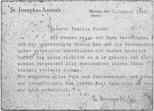 Nachricht der St. Josephs-Anstalt Herten von 1940 an die Familie Fuchs