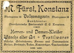 Vermutlich lebte zu diesem Zeitpunkt sein Schwiegervater bereits in Konstanz, ein Schneider Schmolewitz taucht in alten Adressbüchern erstmals 1907 und dann ab 1911 auf.(1) Ein in Konstanz aufgenommenes Hochzeitsfoto von Moritz Fürst und Salomea lässt vermuten, dass die beiden erst in Konstanz geheiratet haben.