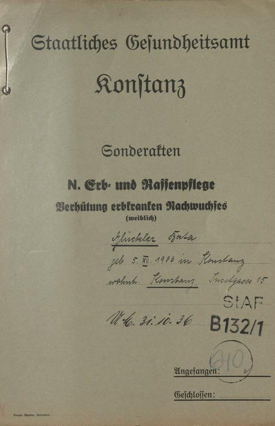 Der Allgemeinmediziner Dr. Hermann Sauter zeigte die damals 28-jährige Berta Glückler am 17. Januar 1935 im Rahmen des Vollzugs des „Gesetzes zur Verhütung erbkranken Nachwuchses“ beim Konstanzer Gesundheitsamt wegen „erblicher Taubheit“ an. Mit diesem Gesetz und der Unterscheidung zwischen „erbgesund“ und „erbkrank“ war zum 1. Januar 1934 ein Instrument geschaffen worden, das der – aus der Sicht des NS-Regimes – vorliegenden „Degeneration“ des deutschen Volkes entgegenwirken sollte, indem als „erbkrank“ erachtete Menschen auch gegen ihren expliziten Willen an der Weitergabe ihrer „minderwertigen Erbanlagen“ gehindert werden sollten.