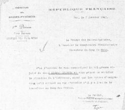 Ausreisegenehmigung der Préfecture Basses-Pyrènées, genehmigt am 2.1.1941, dass Alfred Spiegel zwecks Auswanderung aus dem Lager Gurs ins Lager Les Milles verlegt wird