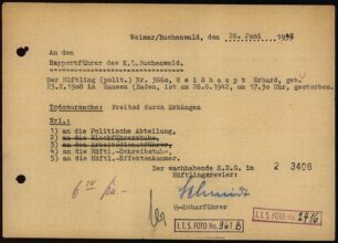 Merkwürdig ist jedenfalls, dass der Tod von Weißhaupt amtlich für den 26. Juni 1942 bezeugt ist, er aber noch am 27. Juni auf der Transportliste von Quedlinburg nach Buchenwald als Häftling des Blocks 29 geführt wurde. Diese Ungereimtheit lässt sich wohl so erklären, dass Weißhaupt im Außenlager Quedlinburg wahrscheinlich von Blank erschossen oder in den Freitod getrieben wurde. Um Nachfragen zu vermeiden, wurde Weißhaupt als Toter zurück in das Stammlager Buchenwald transportiert und beim täglichen morgendlichen Zählappell als tot gemeldet. Sein Leichnam wurde im Krematorium des Lagers verbrannt und die Asche auf dem Lagergelände verstreut.