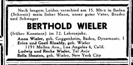 Am 15. März 1948 starb Berthold Wieler in Baden/Schweiz im Alter von 72 Jahren.
